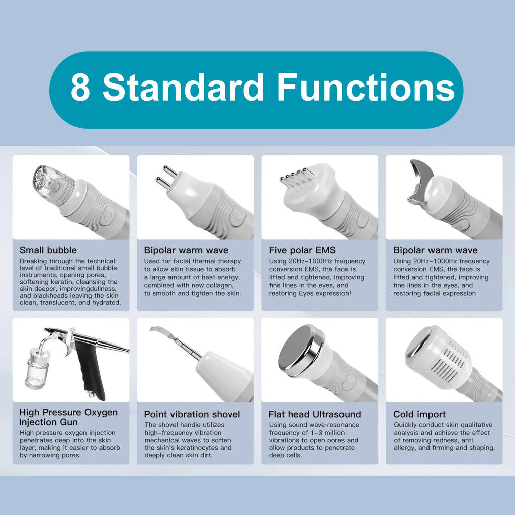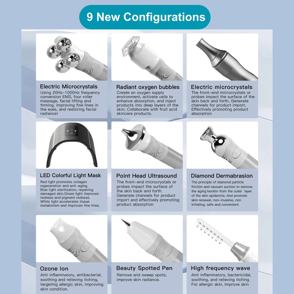 1. Small Bubble Handle: Advances beyond traditional small bubble technology, opening pores and deeply cleansing. It enhances keratin removal, reduces oiliness and blackheads, and hydrates the skin, leaving it clean and radiant.