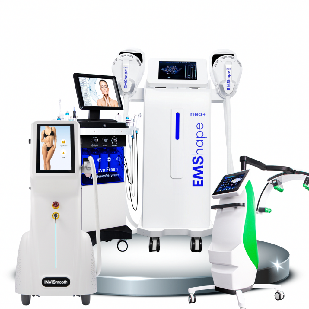 This equipment package provides a full solution for delivering cutting-edge treatments to your clients' bodies and faces, including , but not limited to, body sculpting, hair removal, slimming, skin tightening, aquafacial, and anti-aging procedures.