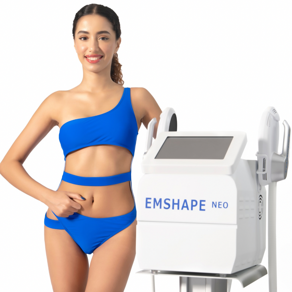 EMShape® Neo handles simultaneously emit both high intensity magnetic and radio frequency (RF) waves. The RF waves heat up and destroy fat cells, so the resulting treatment effect is a combination of both muscle building and fat reduction, and you can achieve a sculpted and slimmed body.